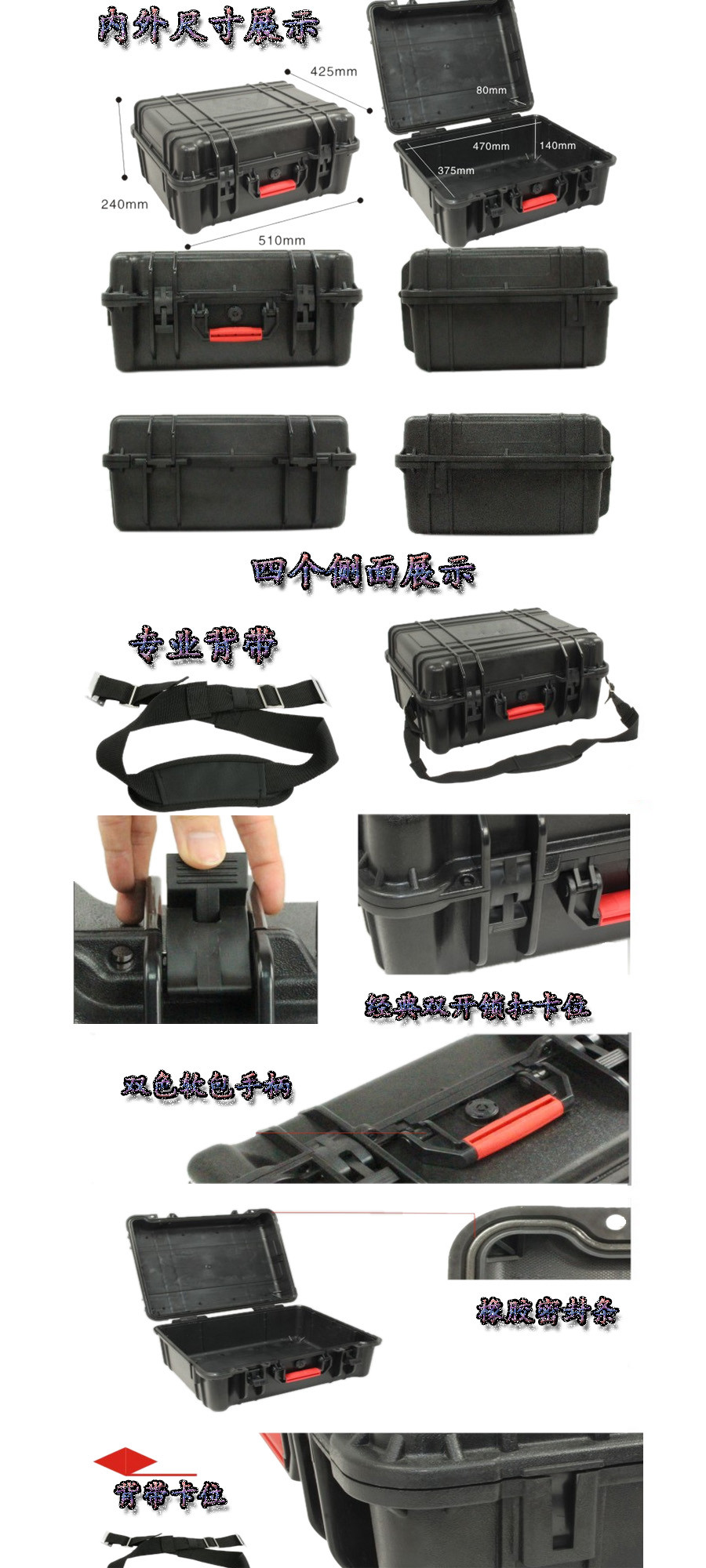 簡(jiǎn)要說(shuō)明:廣泛用于傳媒、公安、消防、軍隊(duì)、航空、戶外攝影、野外考察、科學(xué)探測(cè)等眾多領(lǐng)域的高端儀器、儀表。具有高強(qiáng)度、高抗壓沖擊、防潮、絕對(duì)密封、防塵、防水等特點(diǎn)。產(chǎn)品材質(zhì):ABS原料,箱體采用高抗沖擊的高分子聚合材料一體注塑成型,密封采用扁型彈性發(fā)泡密封橡膠條,確保防水氣密,所有較軸均采用不銹鋼材質(zhì)。