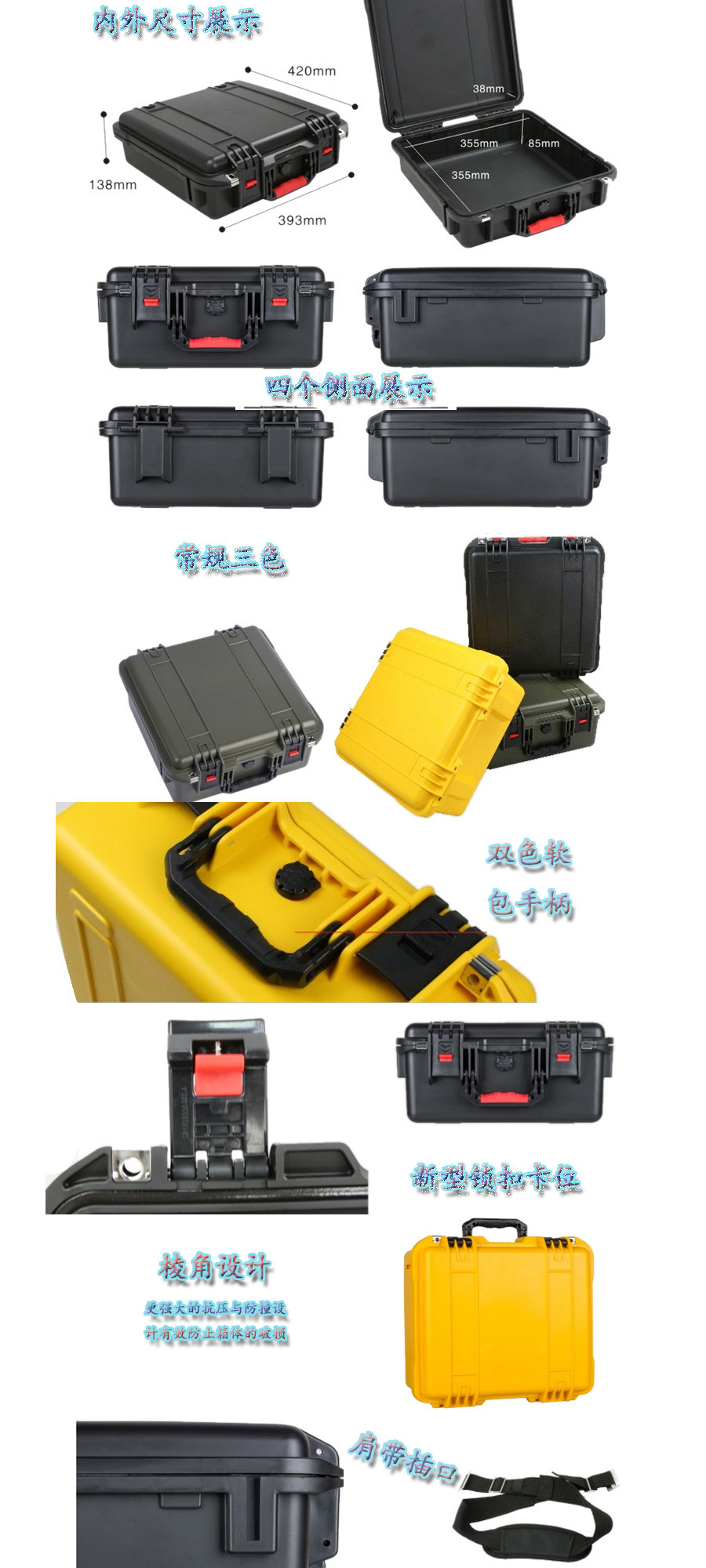 簡(jiǎn)要說(shuō)明:廣泛用于傳媒、公安、消防、軍隊(duì)、航空、戶外攝影、野外考察、科學(xué)探測(cè)等眾多領(lǐng)域的高端儀器、儀表。具有高強(qiáng)度、高抗壓沖擊、防潮、絕對(duì)密封、防塵、防水等特點(diǎn)。產(chǎn)品材質(zhì):ABS原料,箱體采用高抗沖擊的高分子聚合材料一體注塑成型,密封采用扁型彈性發(fā)泡密封橡膠條,確保防水氣密,所有較軸均采用不銹鋼材質(zhì)。