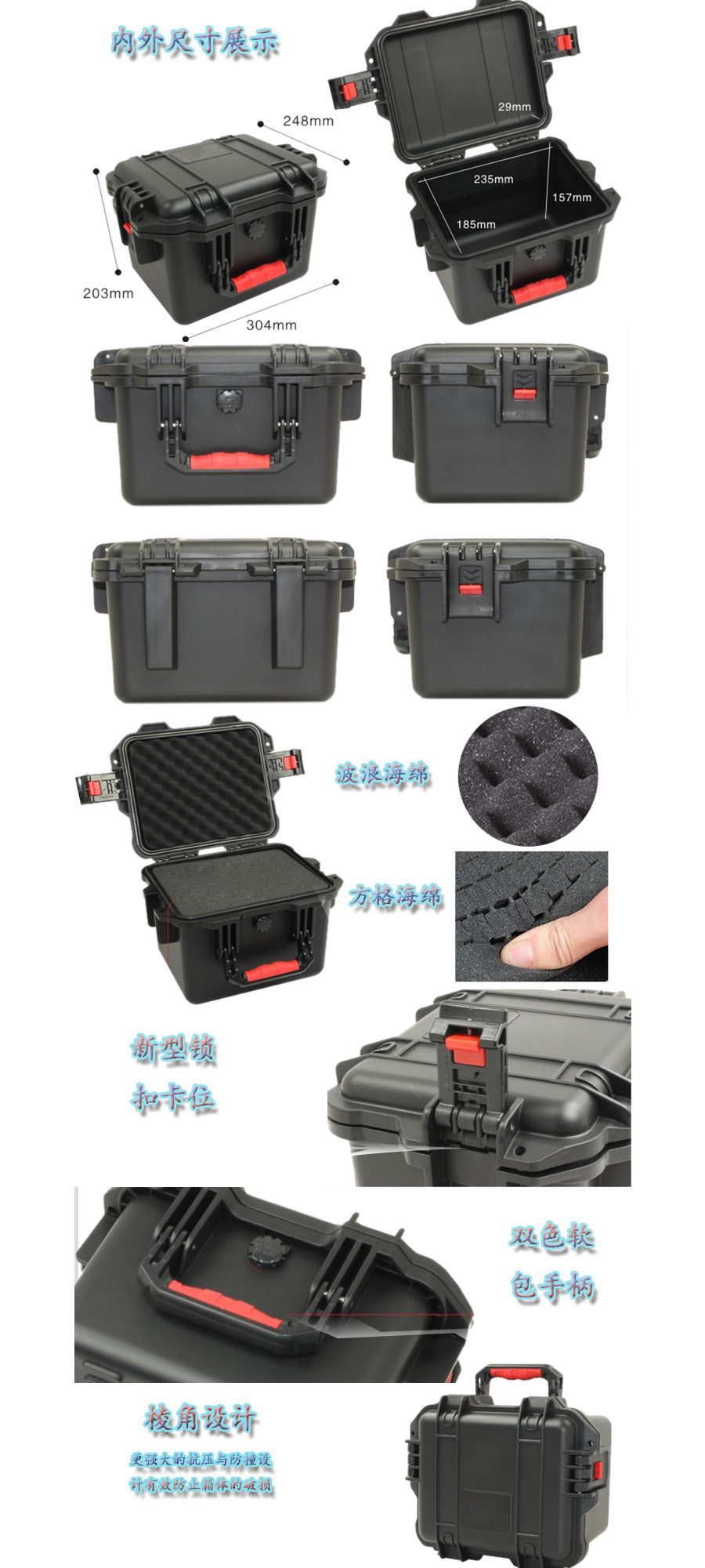 簡(jiǎn)要說(shuō)明:廣泛用于傳媒、公安、消防、軍隊(duì)、航空、戶外攝影、野外考察、科學(xué)探測(cè)等眾多領(lǐng)域的高端儀器、儀表。具有高強(qiáng)度、高抗壓沖擊、防潮、絕對(duì)密封、防塵、防水等特點(diǎn)。產(chǎn)品材質(zhì):ABS原料,箱體采用高抗沖擊的高分子聚合材料一體注塑成型,密封采用扁型彈性發(fā)泡密封橡膠條,確保防水氣密,所有較軸均采用不銹鋼材質(zhì)。